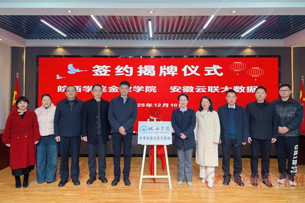 在安徽云联大数据技术有限公司座谈时,胡林娜详细介绍了学院的办学历史、专业特色、人才培养模式及近年来在学科建设与科学研究方面取得的成果。她强调,要发挥皖西学院人才优势、专业优势,为地方发展贡献学院力量。邱前东介绍了舒城县产业发展情况和人才工作情况,他指出,希望以此次对接为起点,与学院携手共进,建立常态化沟通机制,推动产学研合作,打造资源共享、优势互补的校地企共赢新样板。随后,双方签订合作协议,并就设立“皖西学院大学生就业实习基地”举行揭牌仪式。